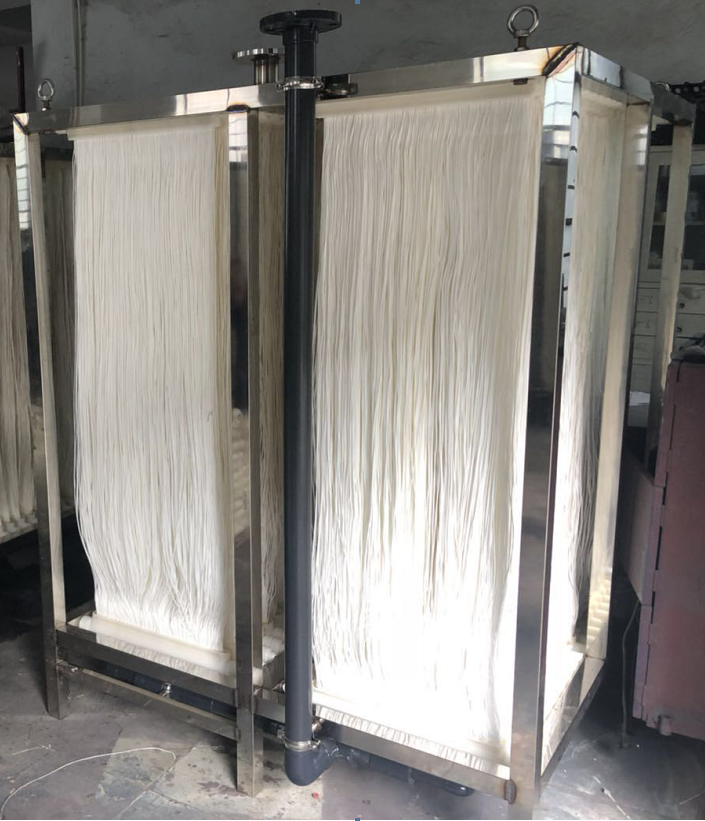 9、 膜組件設有曝氣管,對膜絲進行氣水沖刷,維護膜的通量,也可利用生化池的曝氣過程對膜纖維表面進行清洗,保持穩定的產水量。